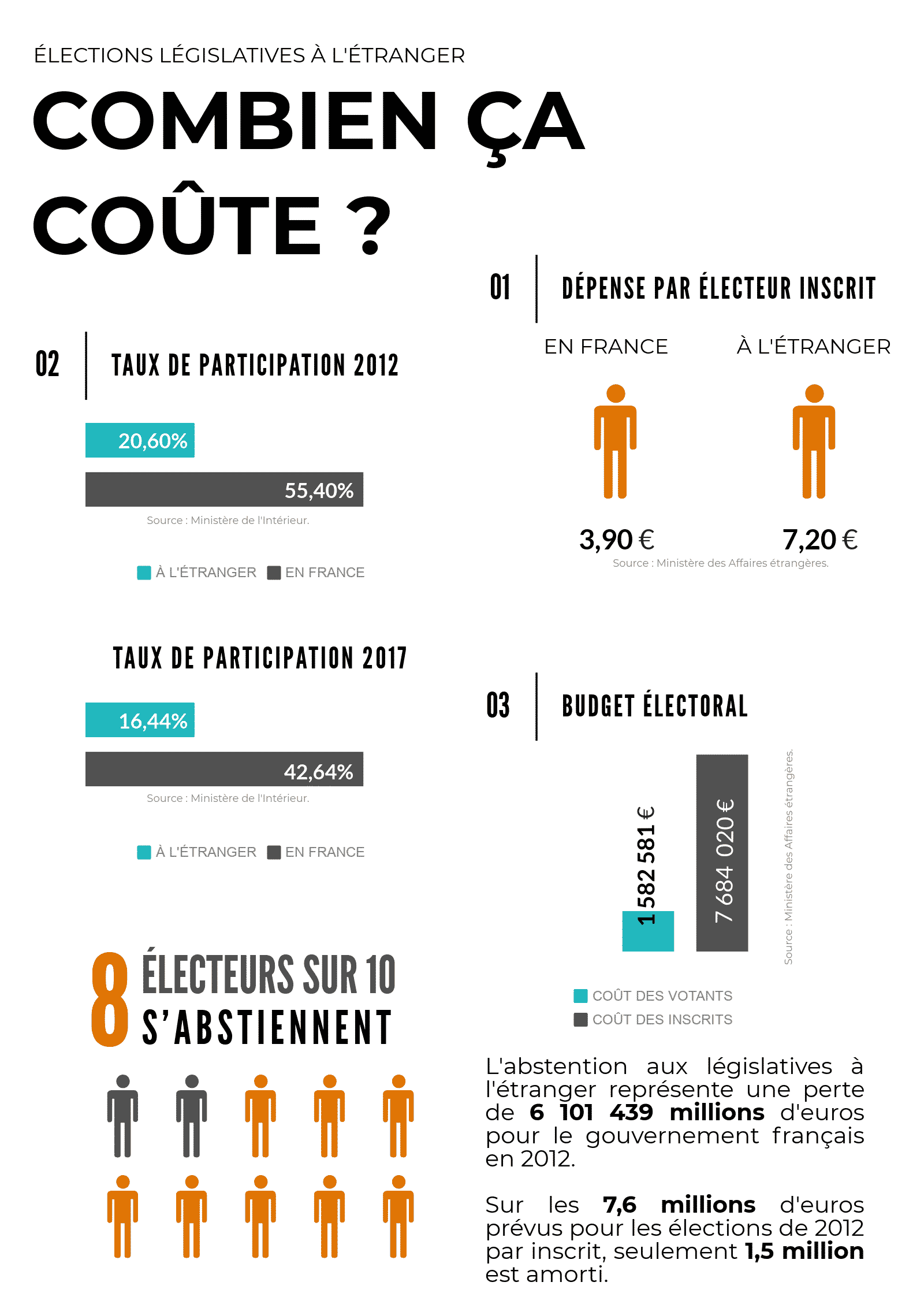 La Cour des Comptes avait constaté, dès les premières législatives des Français hors de France en 2012, que la dépense par électeur inscrit était « nettement supérieure pour les inscrits à l’étranger que pour les inscrits en France avec un écart de l’ordre de 1 à 3 pour les élections présidentielle et législatives (20,50€ à l’étranger contre 7,45€ en France) ». Alors si on calcule le coût par voix, avec un taux d’abstention à plus de 92% comme dimanche dernier dans la péninsule ibérique, les chiffres s’envolent.