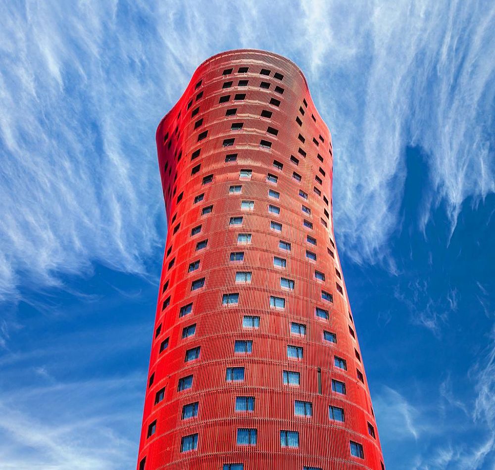 Ce gratte-ciel de 113 mètres de haut surprend par sa forme et sa couleur flambant rouge. Cet immeuble de l’Hospitalet de Llobregat accueille l’Hôtel Porta Fira. Son architecte, le japonais Toyo Ito, s’est inspiré de la forme des fleurs de lotus pour imaginer ce drôle de bâtiment qui a remporté en 2010, l’année de son inauguration, l’Emporis Skyscraper Award qui récompense les gratte-ciels les plus impressionnants.