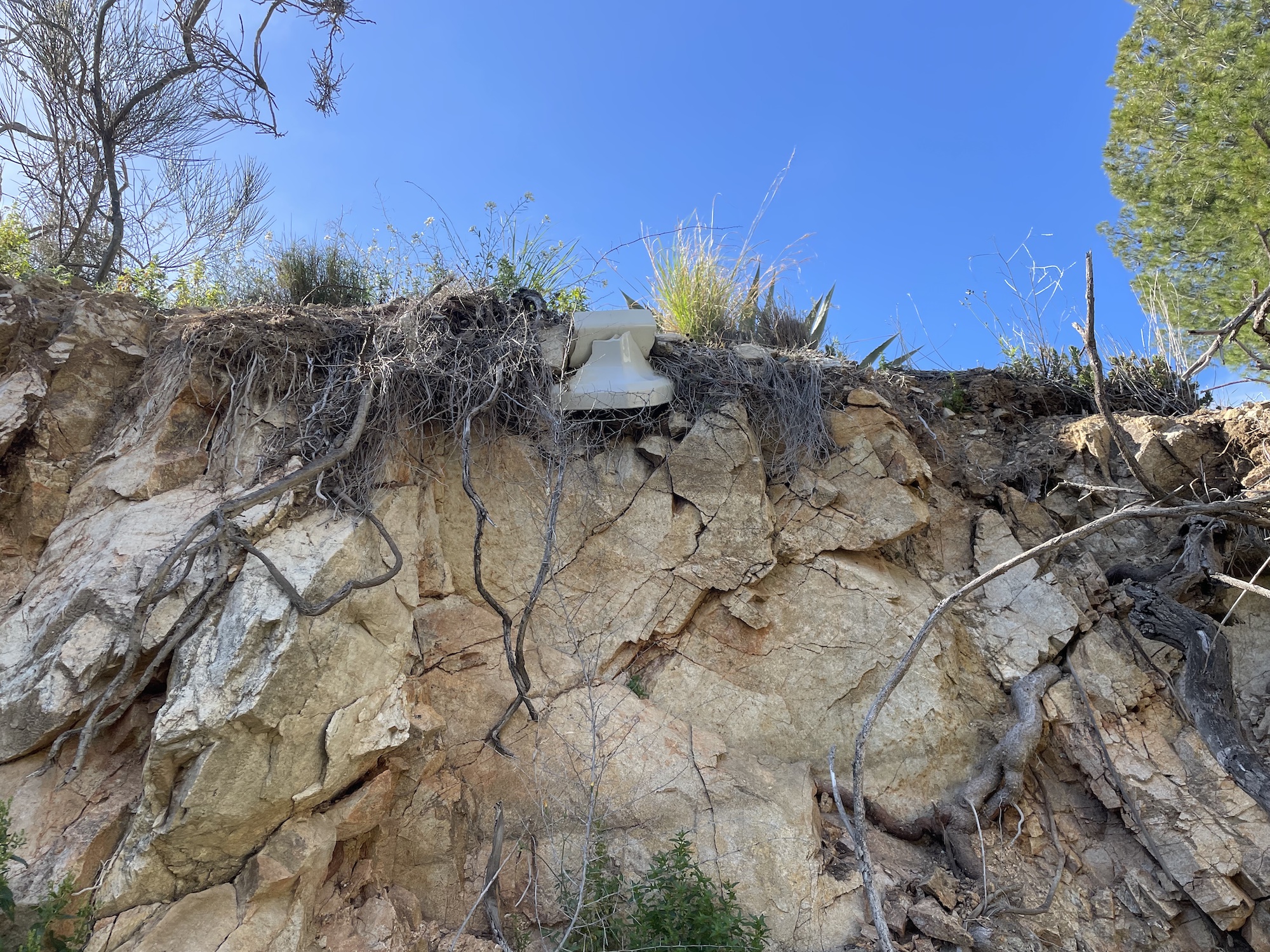 Car ces décharges ne datent pas d’hier. Selon Odette, Ivan Patrici et Ignasi, qui a réalisé le circuit, elles sont nées dans les années 60 et 70, alors que Barcelone construisait à tour de bras et qu’il était bien commode de venir se débarrasser des déchets de chantier dans les premiers mètres du parc natural adjacent. Le collectif a identifié sur place des résidus datant de cette époque : carrelage, pièces de monnaie, bouteilles en verre, jouets, matériel de construction et électroménager. Certains sont là depuis si longtemps qu’ils sont recouverts de terre et de végétation, comme cette cuvette de WC qui semble incrustée dans la colline. Les vieux déchets sont régulièrement rejoints par des apports plus récents, des dizaines de pneus il y a quelques mois, une fourgonnette sans moteur il y a quelques jours. « La merde attire la merde ».