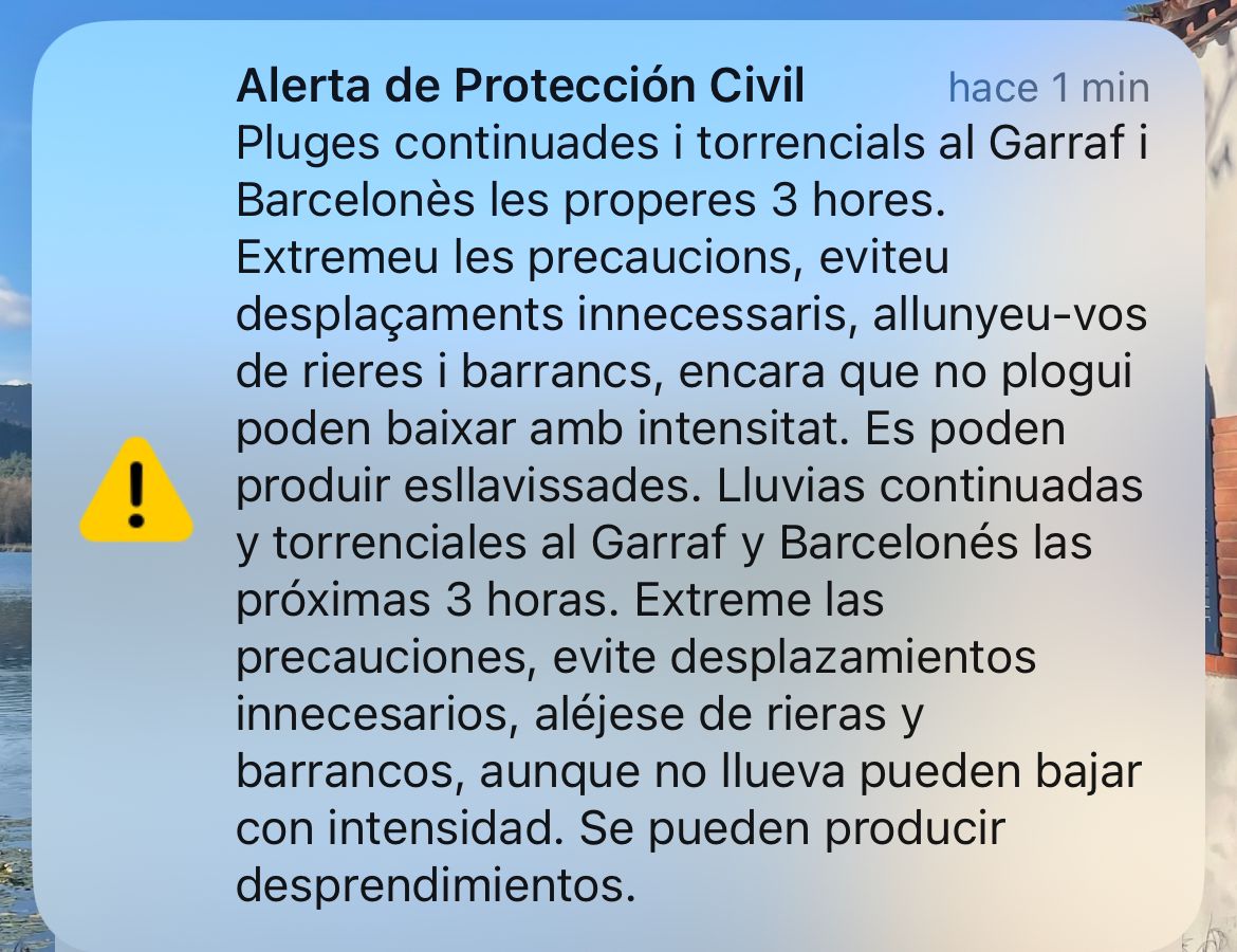 10h30 : Les habitants de Barcelone et sa banlieue et ceux du Garraf ont reçu l’alerte de la Protection civile sur leur téléphone juste avant 10h30, avertissant de pluies torrentielles dans les 3 prochaines heures.